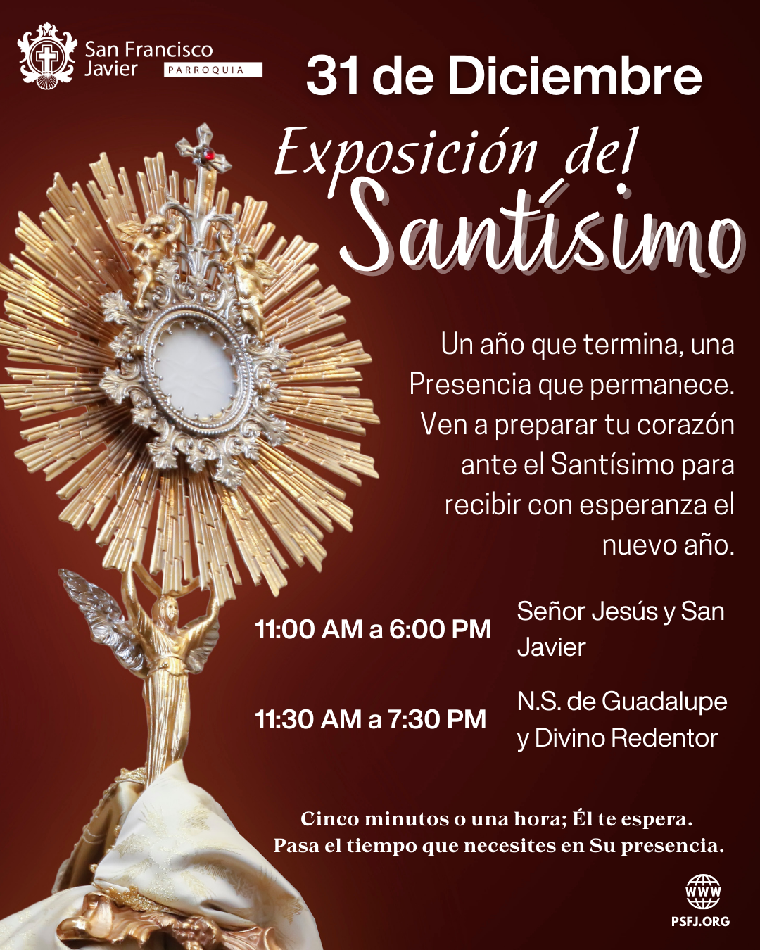 Un año que termina, una Presencia que permanece. Ven a preparar tu corazón ante el Santísimo para recibir con esperanza el nuevo año. ¿Qué es? Es el momento en que la Hostia Consagrada (que es el Cuerpo de Cristo) se coloca en la Custodia (el objeto dorado con rayos) sobre el altar. Ya no está […]