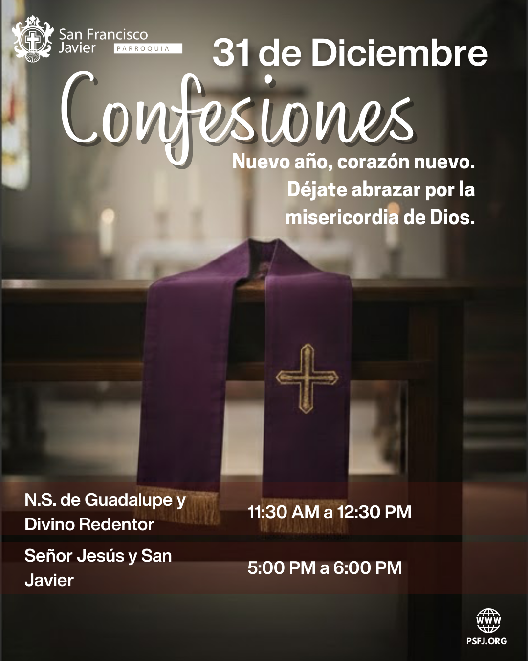 "No inicies un año nuevo con cargas viejas. El Señor te espera para regalarte su perdón y que comiences el 2026 con el corazón limpio, ligero y en paz." ¡Borrón y cuenta nueva! Ven al Sacramento de la Reconciliación y prepara tu corazón para las bendiciones de este nuevo año. Lugar: Señor Jesús y San Javier